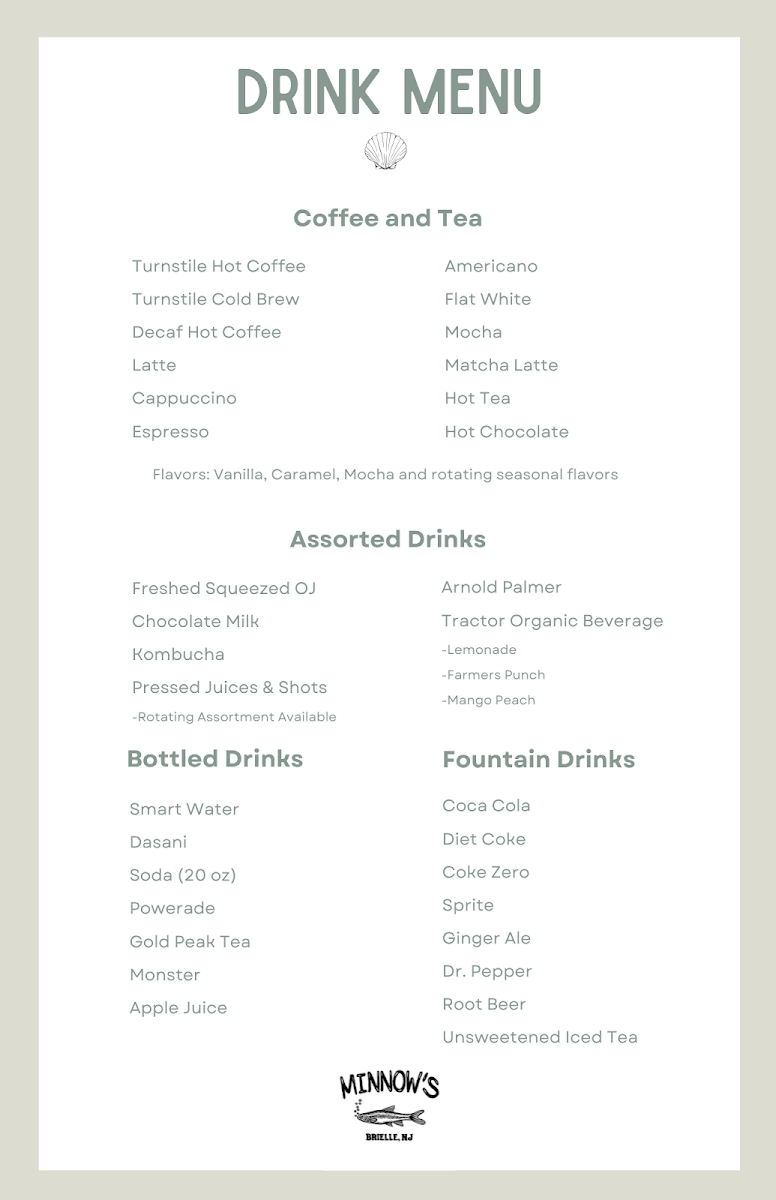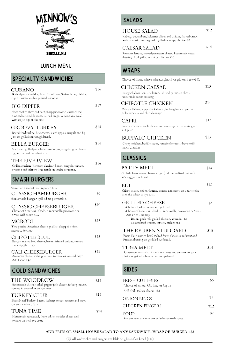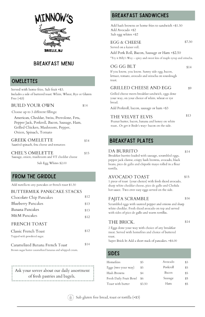 Welcome to Minnow's Cafe, an idyllic haven nestled at 416 Higgins Ave, Brielle, NJ. It embodies coastal charm and offers a delightful menu perfect for breakfast and lunch enthusiasts.